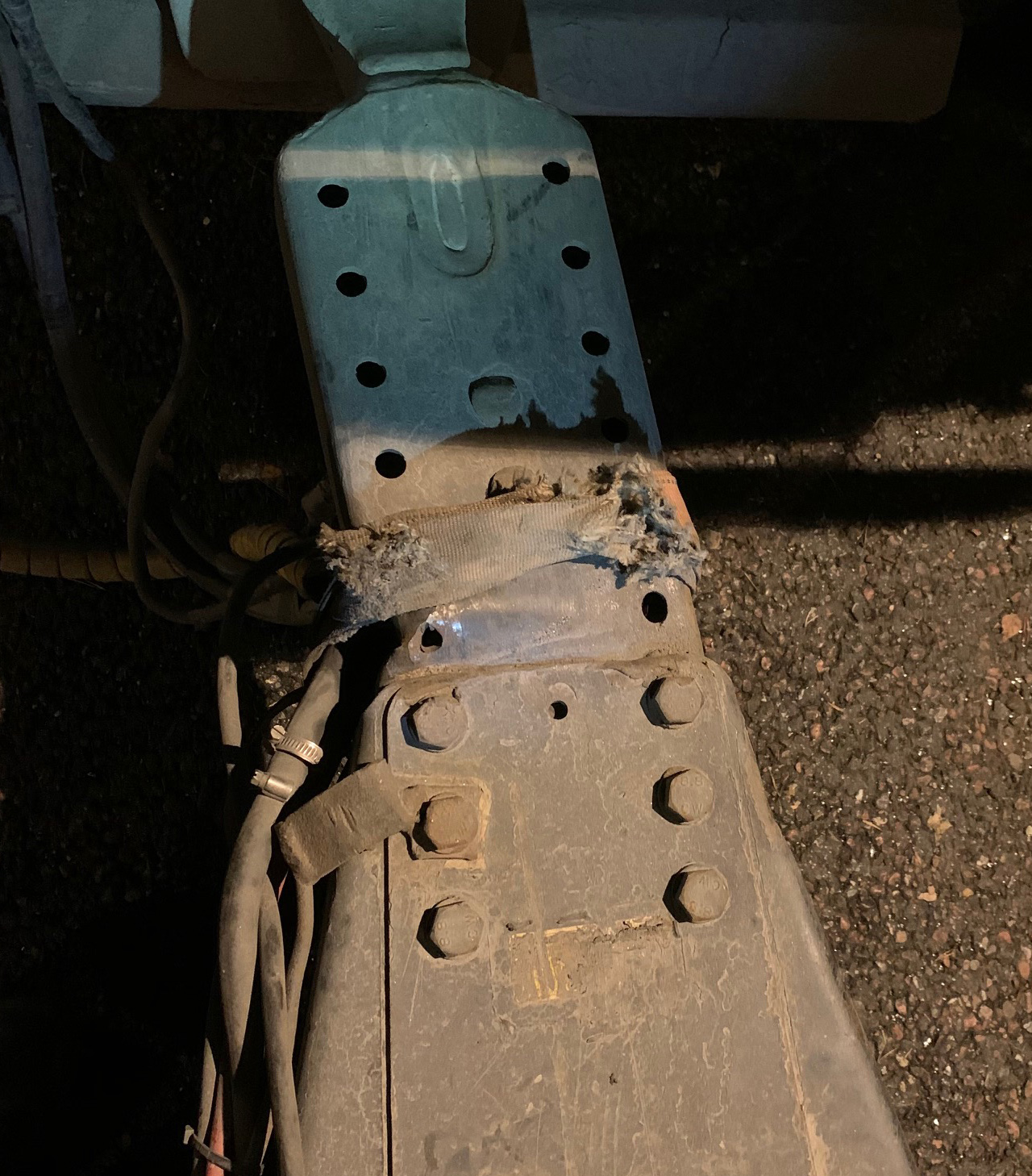 – Det som sticker ut är att dragstången är rejält tilltryckt och böjd vilket leder till ett tekniskt körförbud då det finns risk att den går av. Trots att dragstången är krökt, är ekipaget dessutom längre än 24 meter, säger han.
