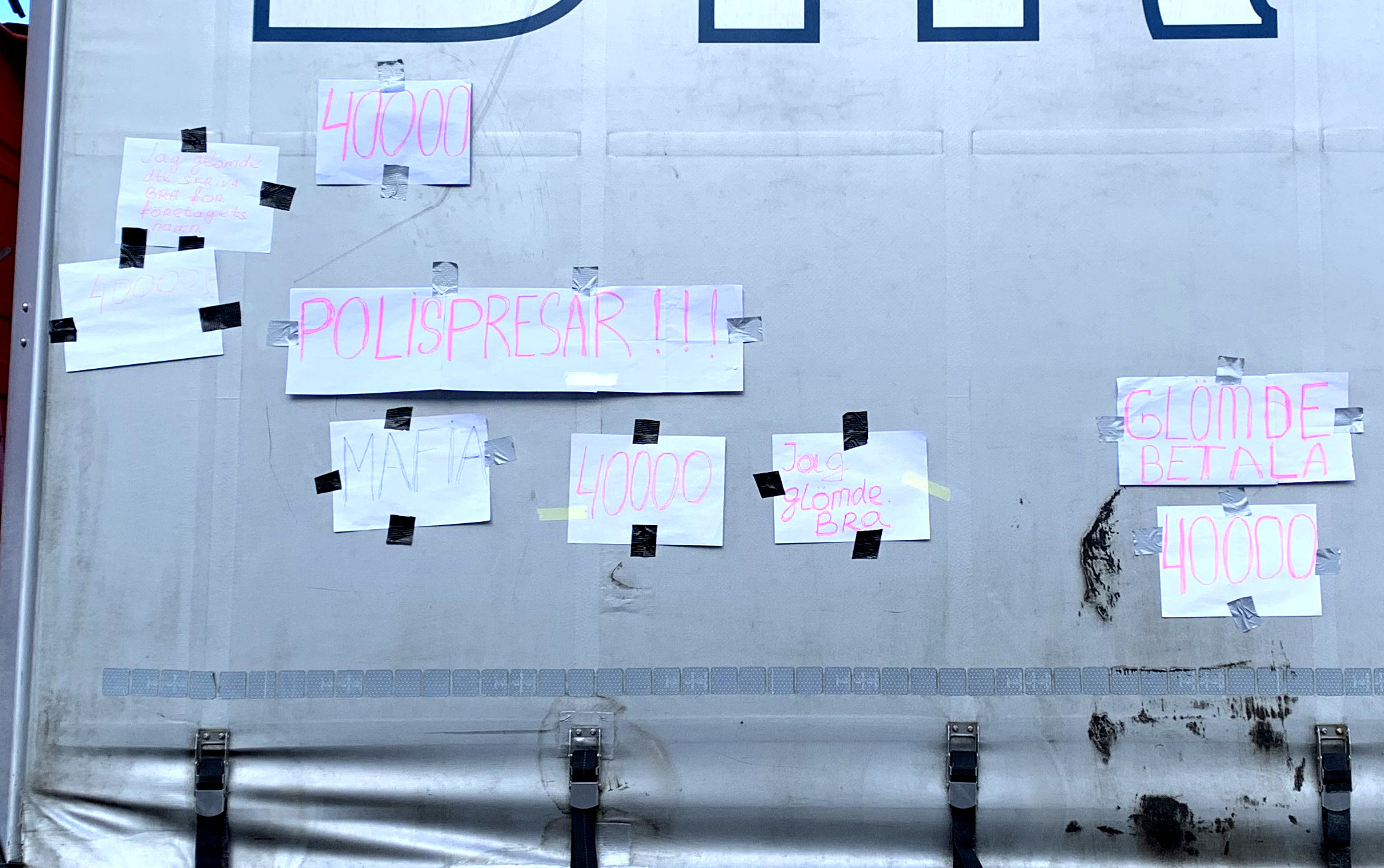 ”Jag glömde att skriva bra för företagets namn”, ”glömde betala”, ”40 000”, ”Mafia” och ”Polispresar” stod det att läsa på trailern. Vad det sista betyder är höljt i dunkel, men högst troligt var inte heller den lappen någon hyllning till trafikpolisen.