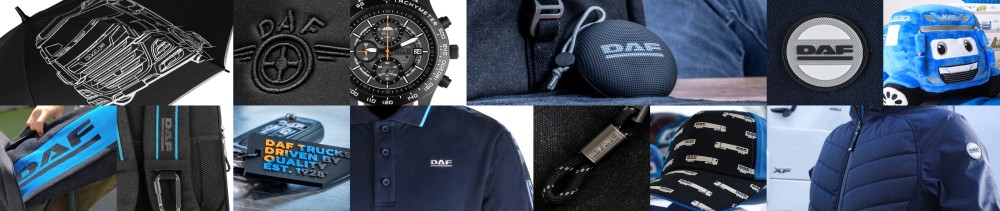 DAF-kollektionen 2021 består av snygga och praktiska kläder, från t-shirts, polotröjor och huvtröjor till kepsar, jackor och strumpor. Det finns även ett stort utbud av tillbehör som robusta väskor, solglasögon, klockor och lyxiga, slitstarka DAF-skinnprodukter.