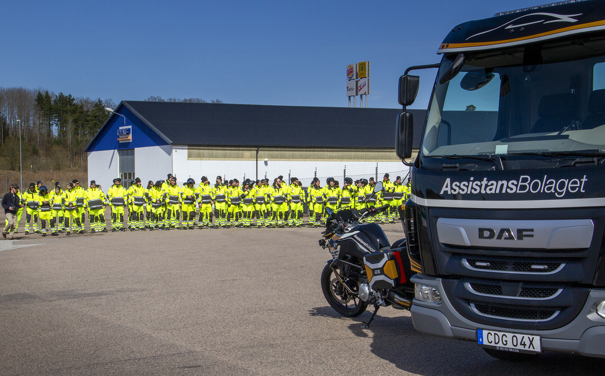 60 vägassistansfordon varav åtta motorcyklar av märket BMW GS, står uppradade i Markaryd när Assistansbolaget presenterar sin nya tjänst som kommer att finnas från Haparanda i norr och Ystad i söder. Fler fordon är på gång. Även tungbärgare?