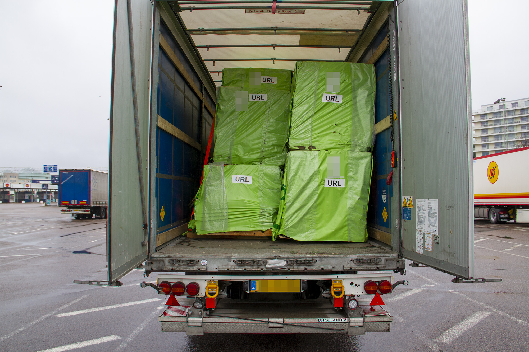 Ett av ekipagen som rullar in på hamnområdet när vi pratar med Farid Umeflod är en holländskregistrerad lastbil med släp. Släpets bakdörrar är öppna och fixerade med spännband. Ombord på släpet syns två splitternya personbilar, en BMW och en Mercedes-Benz.