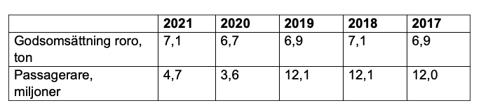 Under 2021 ökade roro-godset med sex procent jämfört med föregående år. Kapellskärs hamn är den hamn i koncernen där tillväxten är starkast, med en ökning av godshanteringen på hela 13 procent jämfört med föregående år.