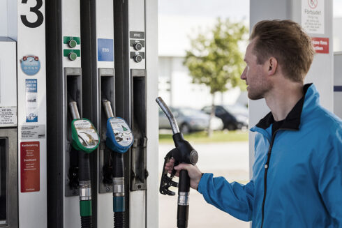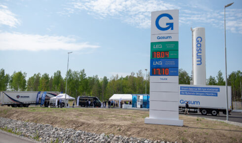 Volvo Lastvagnars vd Roger Alm och Volvos koncernchef Martin Lundstedt ”provtankar” TGM:s helelektriska Volvolastbil. Foto: Tommy Holl