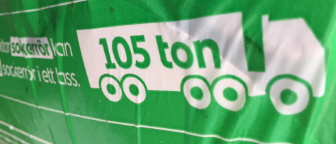 På ICA:s återvinningsbara miljökasse finns en bild på en trailerdragare och tillhörande text som gör gällande att en lastbil fraktar 105 ton sockerrör.